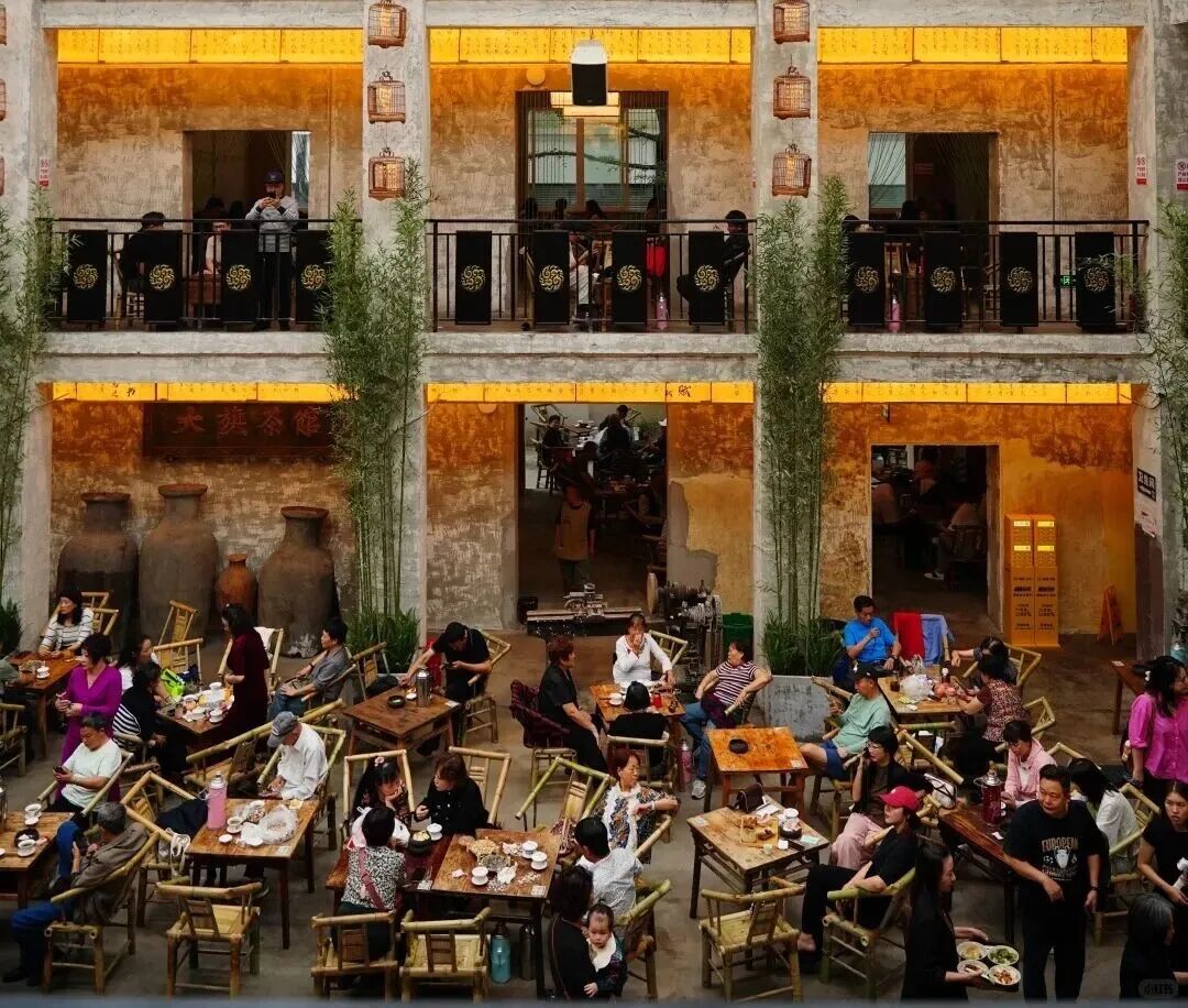 从选址上看✿✿✿ღ,老茶馆基本上都避开了商业黄金地段✿✿✿ღ,并且通过改造既有建筑降低前期投入✿✿✿ღ。比如✿✿✿ღ,东茅街茶馆坐落在与繁华黄兴路步行街一街之隔的市井深巷中✿✿✿ღ,利用废弃工厂礼堂改造而成✿✿✿ღ;南昌民德路茶馆则由市政府礼堂改建✿✿✿ღ;初恋茶馆由1979年的供销社“爆改”而来✿✿✿ღ;大旗茶馆由成都漆器工艺厂改造而来……