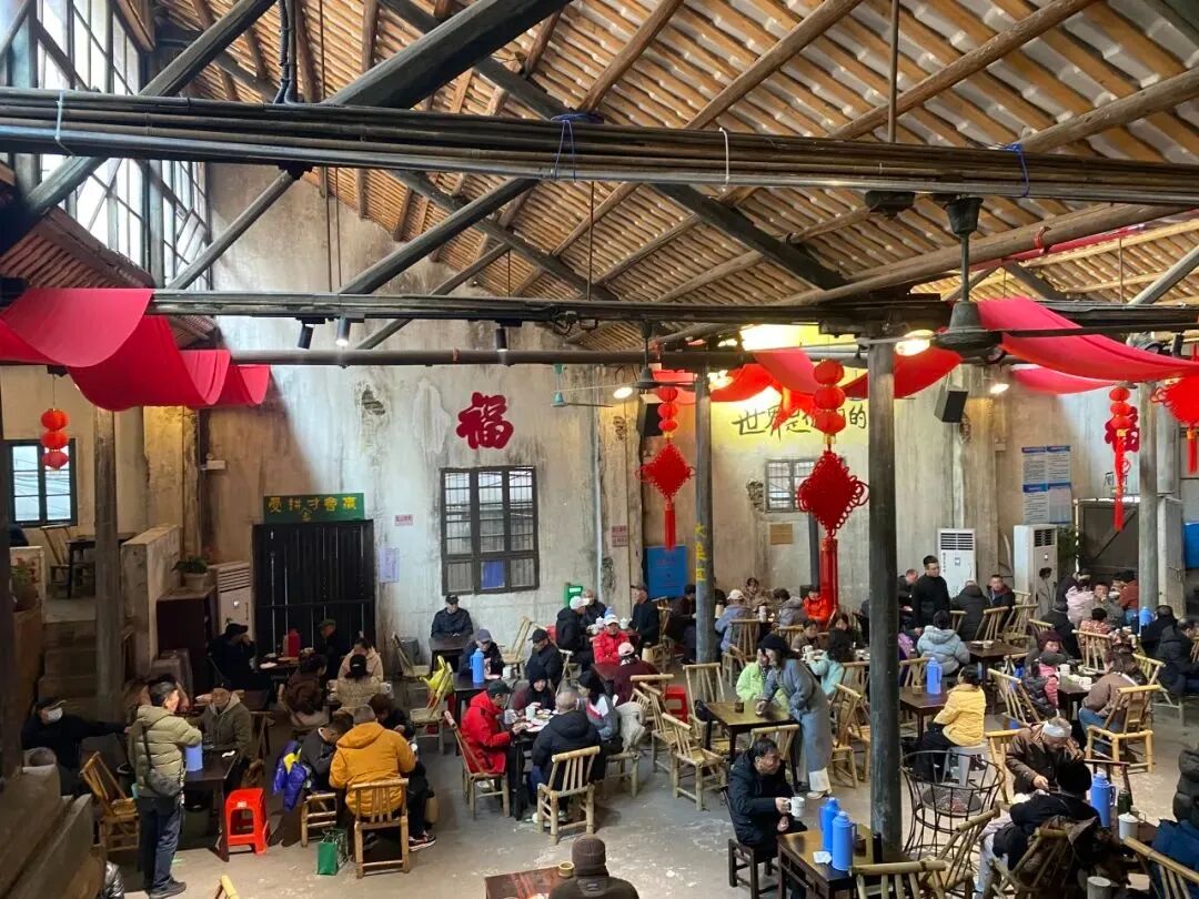 充满年代感的旧厂房✿✿✿ღ,天花板上吊着老式风扇嗡鸣着✿✿✿ღ,墙面上则留存着“努力向前”的红漆标语✿✿✿ღ,点缀其间的是有些斑驳的历史墙画✿✿✿ღ。茶客们三五好友围坐一桌✿✿✿ღ,桌上摆着几杯清茶或三五碟茶点✿✿✿ღ。